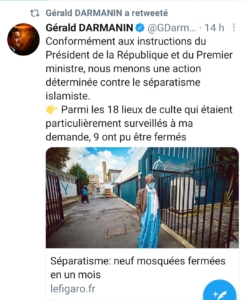 Le ministre de l’Intérieur a annoncé sur Twitter que neuf lieux de culte musulman avaient été fermés sur les 18 «particulièrement surveillés». Neuf salles de prières ou mosquées ont été fermées ces dernières semaines en France, dont huit pour des raisons administratives, a fait savoir le 15 janvier 2021 le ministre de l’Intérieur, Gérald Darmanin.