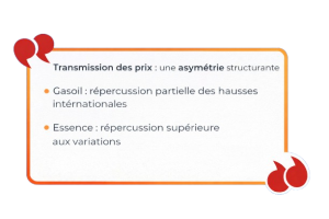 La deuxième note approfondit, en ce sens, l’examen des mécanismes de transmission des variations internationales vers les prix domestiques. Elle met en évidence une asymétrie structurelle : transmission partielle pour le gasoil, plus que proportionnelle pour l’essence. Cette différenciation, loin d’être marginale, révèle l’existence de logiques d’ajustement internes au marché, où la formation des prix procède d’une approche agrégée des marges plutôt que d’une stricte correspondance produit par produit.