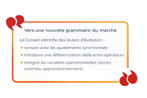 En filigrane, se dessine ainsi une ambition : faire évoluer un marché juridiquement libéralisé vers une configuration où la concurrence ne serait pas seulement formelle, mais pleinement opérante. Cela suppose une remise en question des réflexes hérités — notamment la persistance de calendriers d’ajustement quasi administrés — et une plus grande prise en compte des spécificités propres à chaque opérateur : conditions d’approvisionnement, gestion des stocks, stratégies commerciales.
